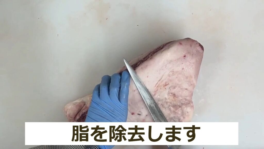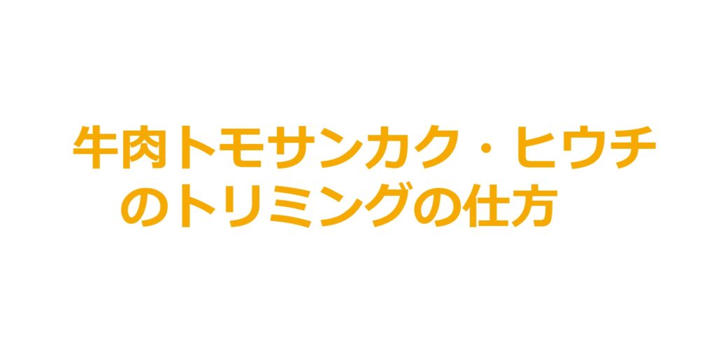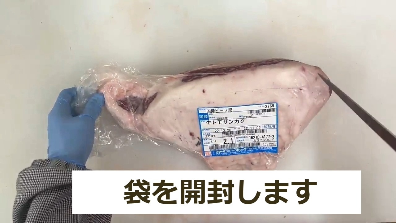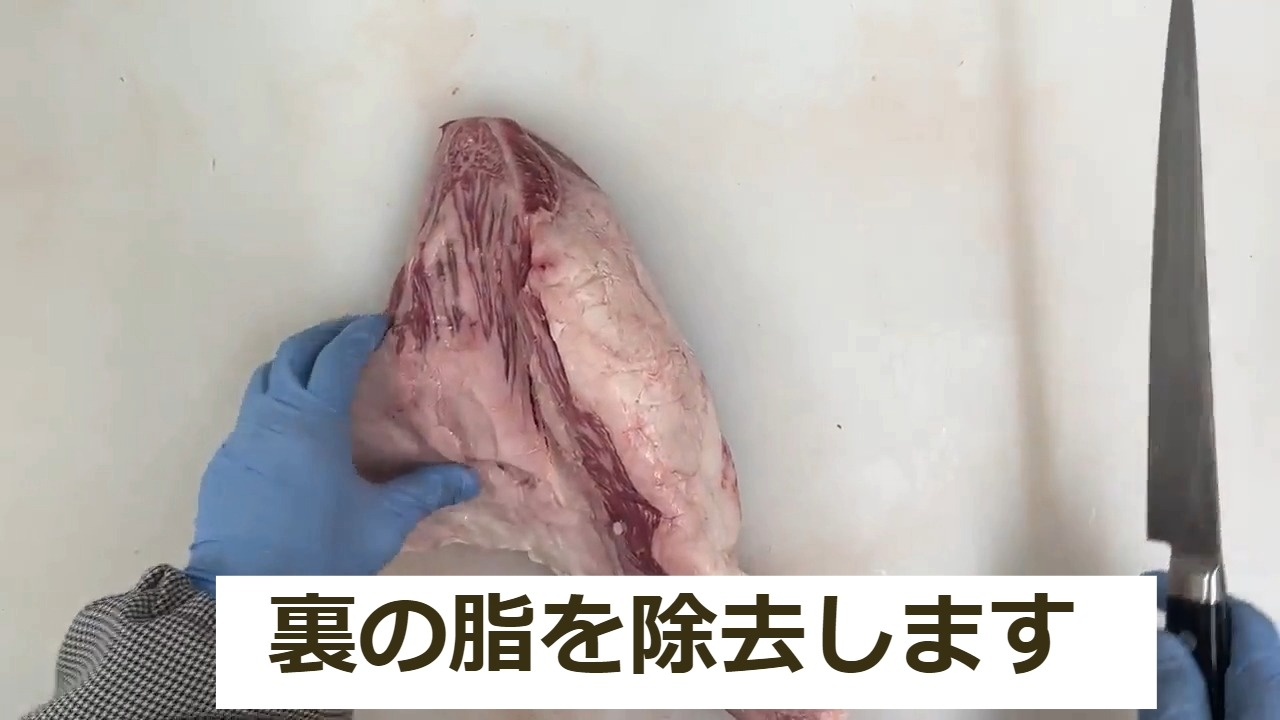 牛肉トモサンカク・ヒウチ(モモ)のトリミング ・STEP1【動画】牛肉トモサンカク・ヒウチのトリミング ・STEP2~作業手順 ※トモサンカク・・比較的脂肪が交雑しているが、見た目ほど柔らかくない STEP1:【動画】牛肉トモサンカク・ヒウチのトリミング STEP2:袋を開封します ・開封する時は、脂身の部分に包丁を入れます。 STEP3:脂を除去します ・基本、脂は捨てます。 牛小間切で脂身が足りない時は、この脂を混ぜて下さい。 STEP4:裏の脂を除去します