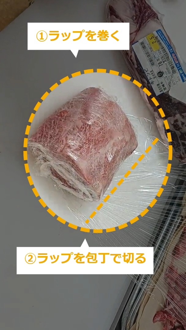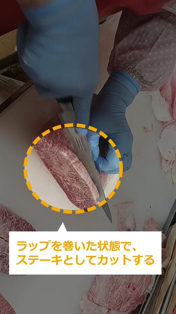 STEP12:ラップを巻いた状態で、ステーキとしてカットする