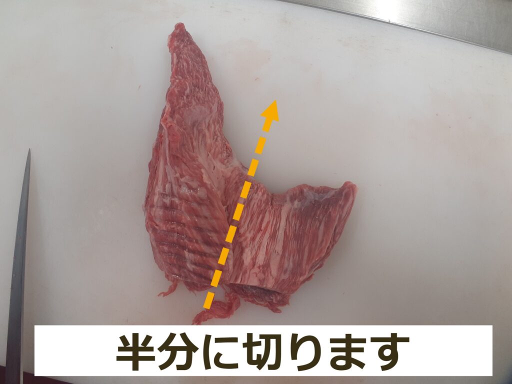 STEP7:肉が長くなってきたら、スライサーから取り出し、半分に切ります。