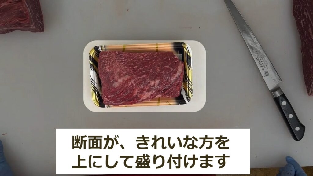 STEP10:モモステーキの商品化③ラップを取ってトレイに盛り付けます