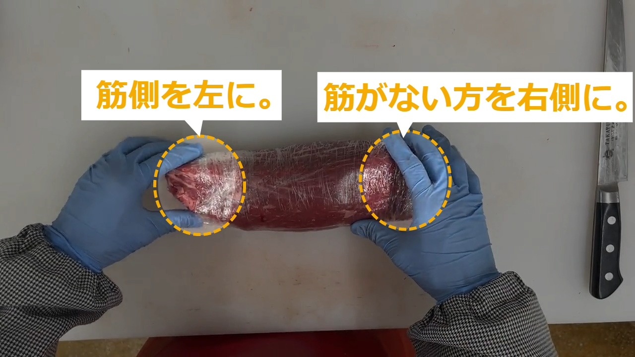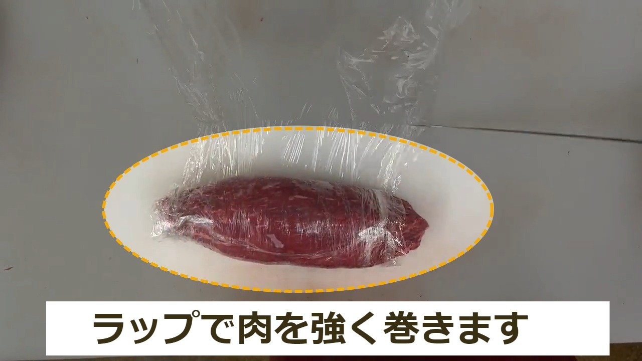 STEP7:モモステーキの商品化①ラップで肉を強く巻きます