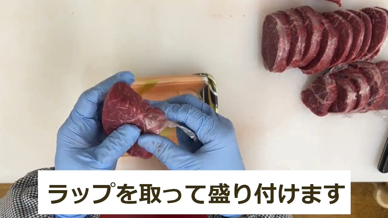 ただしステーキをトレイに盛るとき、ラップが混入しないように注意して下さい。