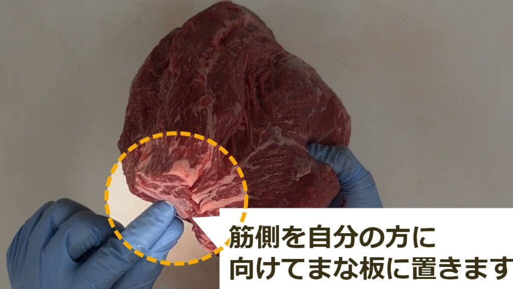 STEP8:モモステーキの商品化②筋側を左側にしてまな板に置きます