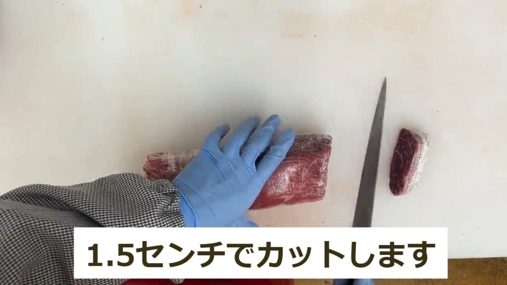 STEP9:モモステーキの商品化③1.5センチでカットします