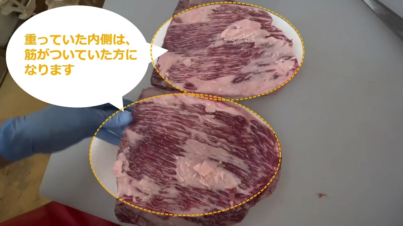 片面は、脂身がついている面で、もう片面は、筋が付いていた面になります。