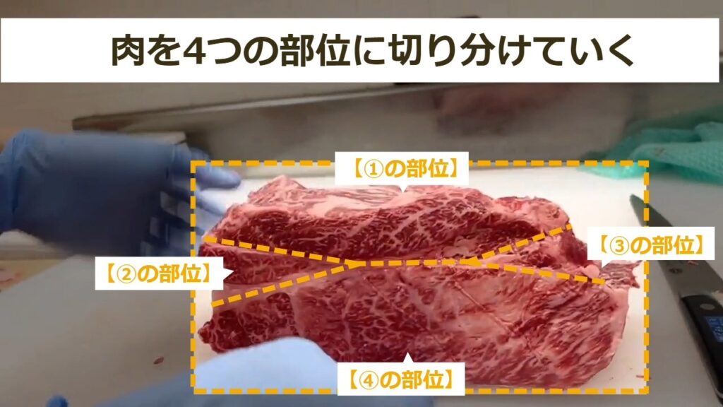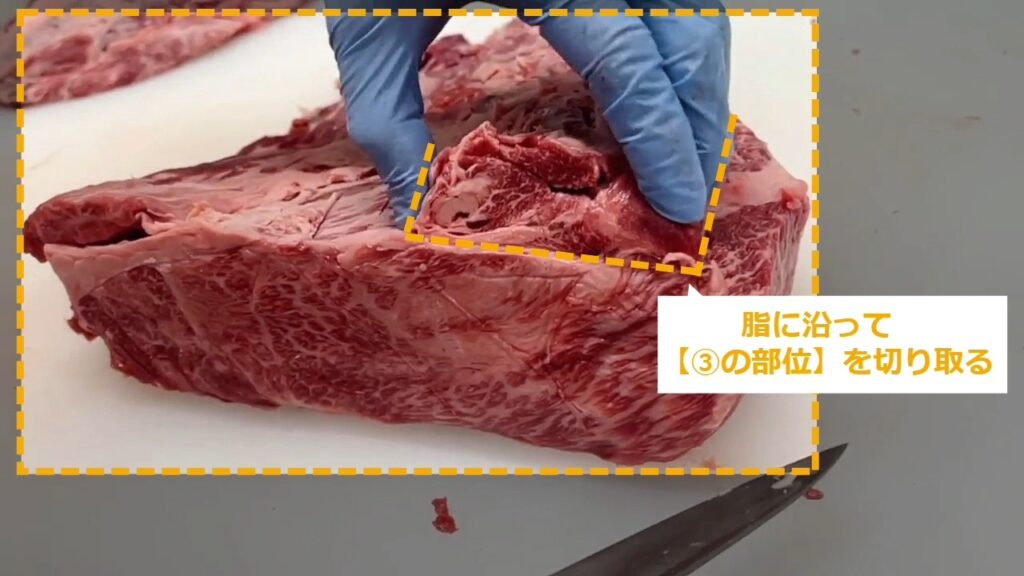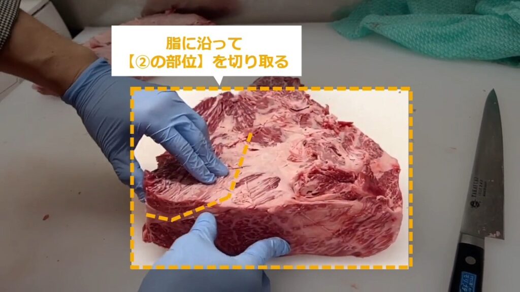 STEP14:肉を4つに切り分ける(2/9)[①の部位]を切り取る