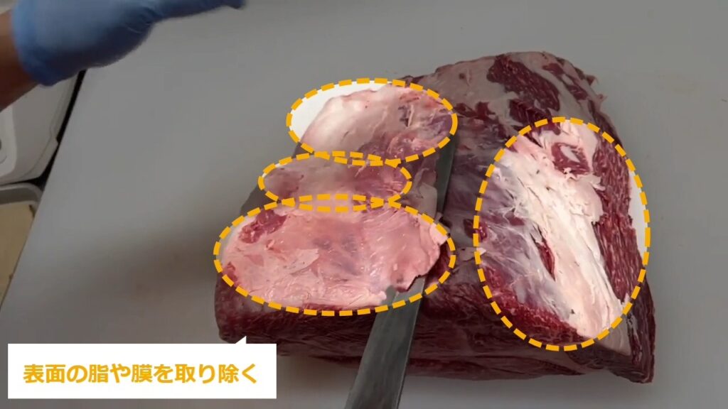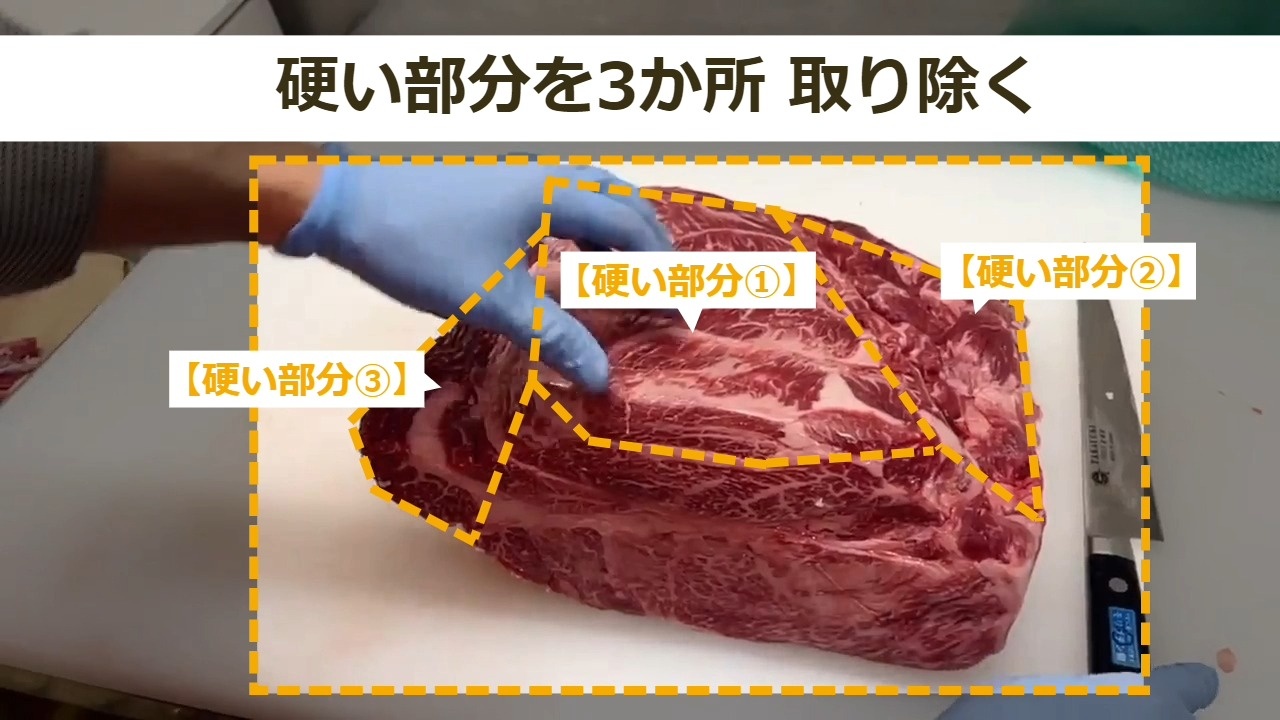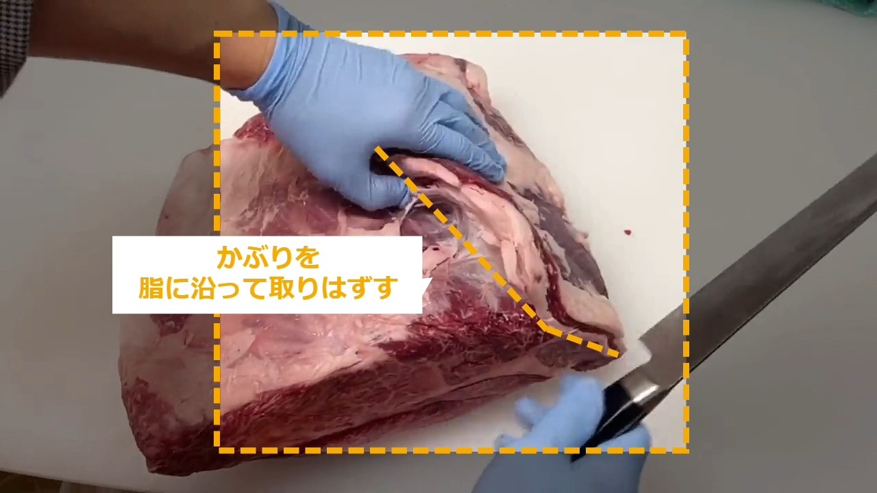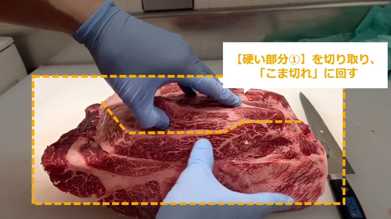 ・「牛肉肩ロース(ネック側)」のトリミングについて説明します。