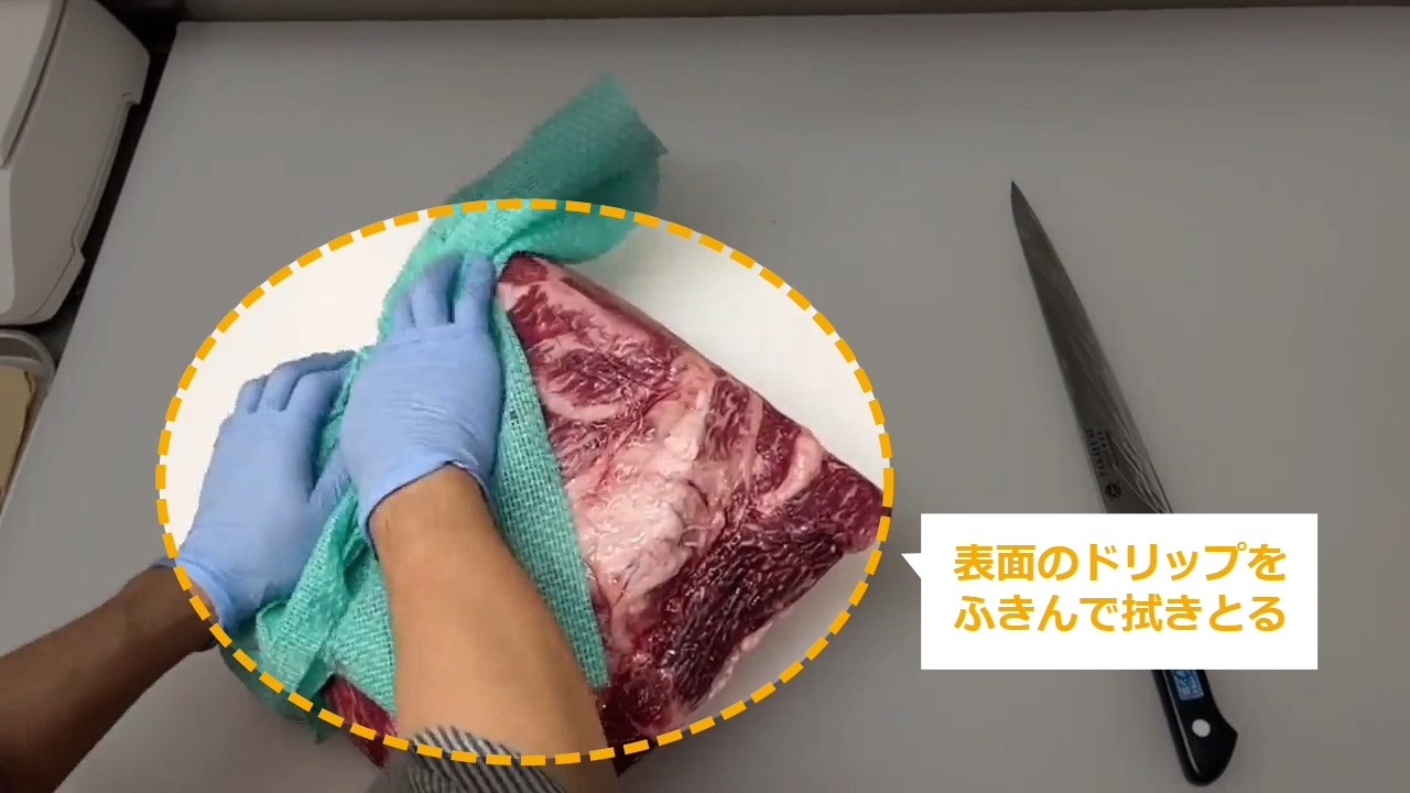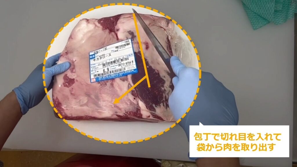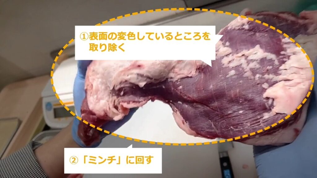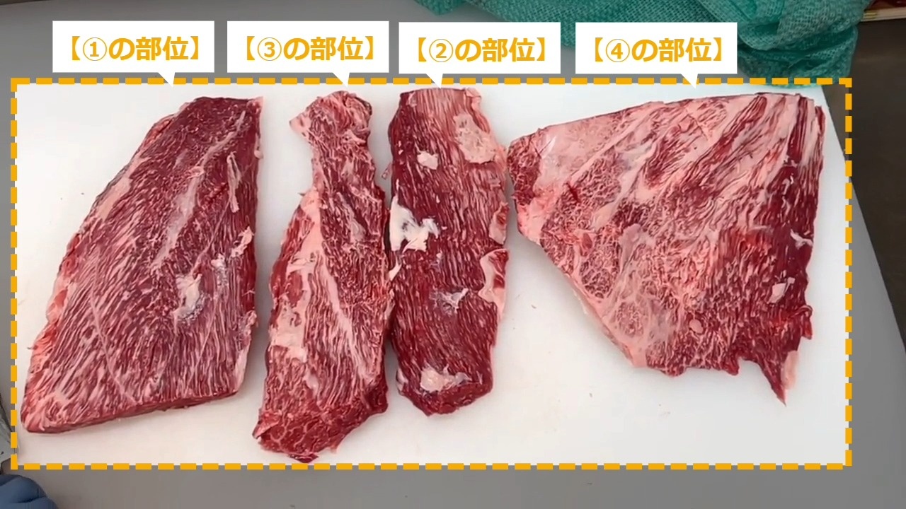 ・「牛肉肩ロース(ネック側)」のトリミングについて説明します。