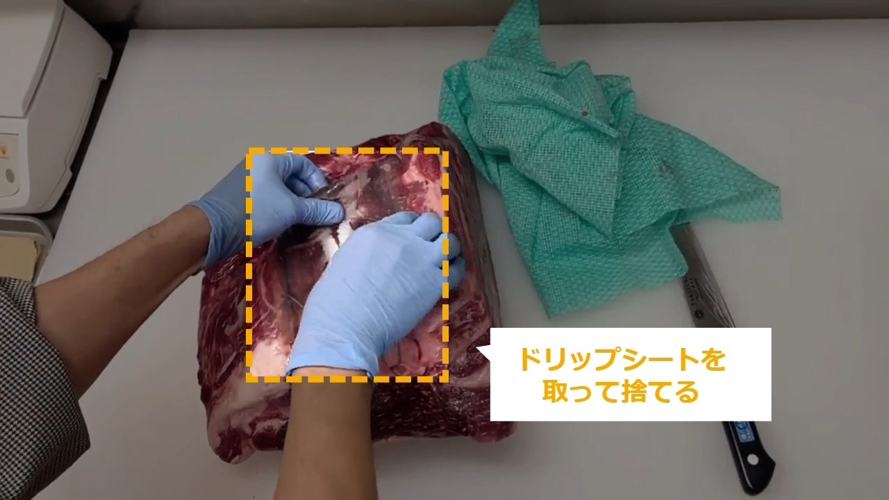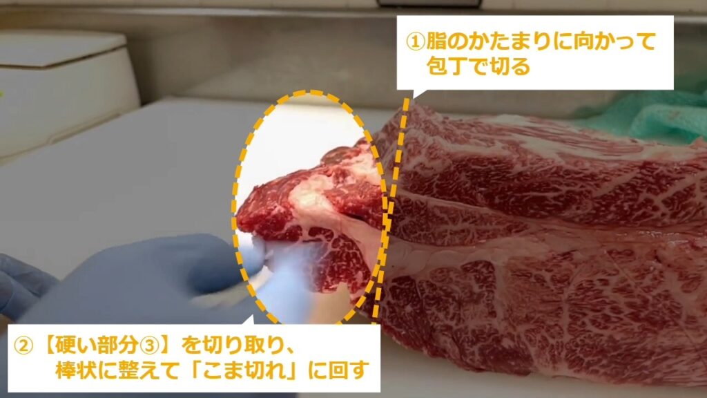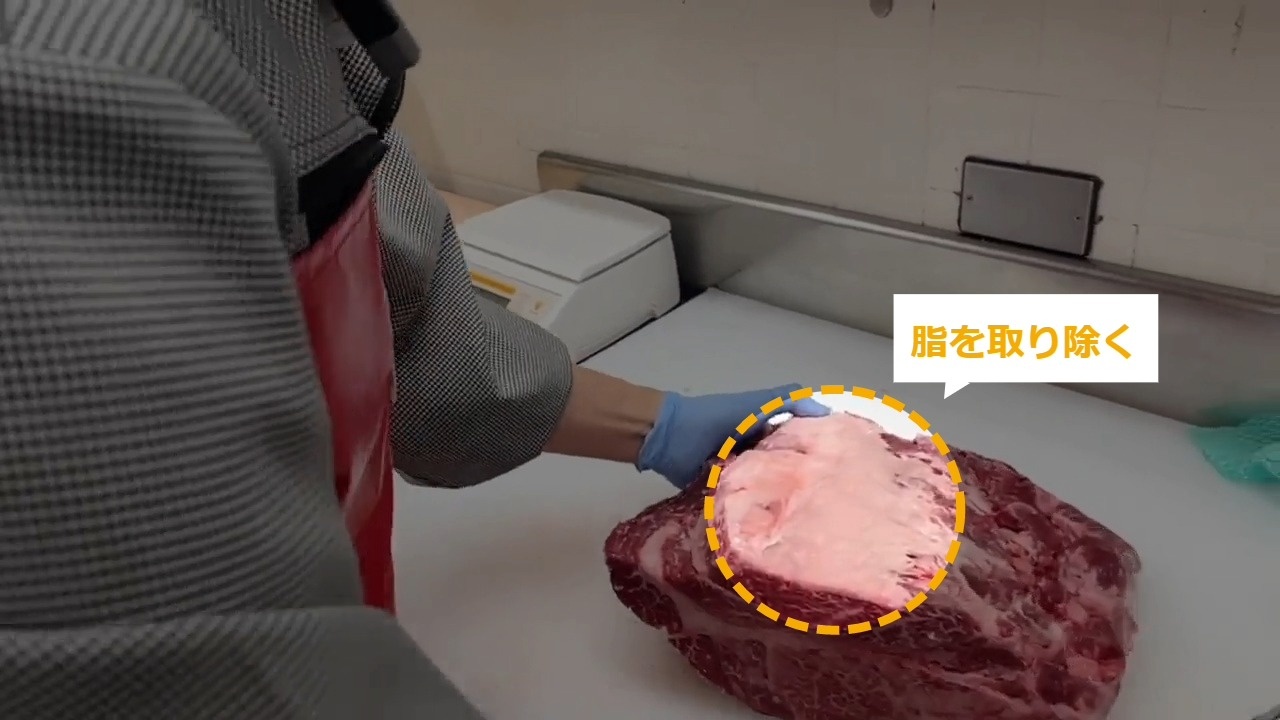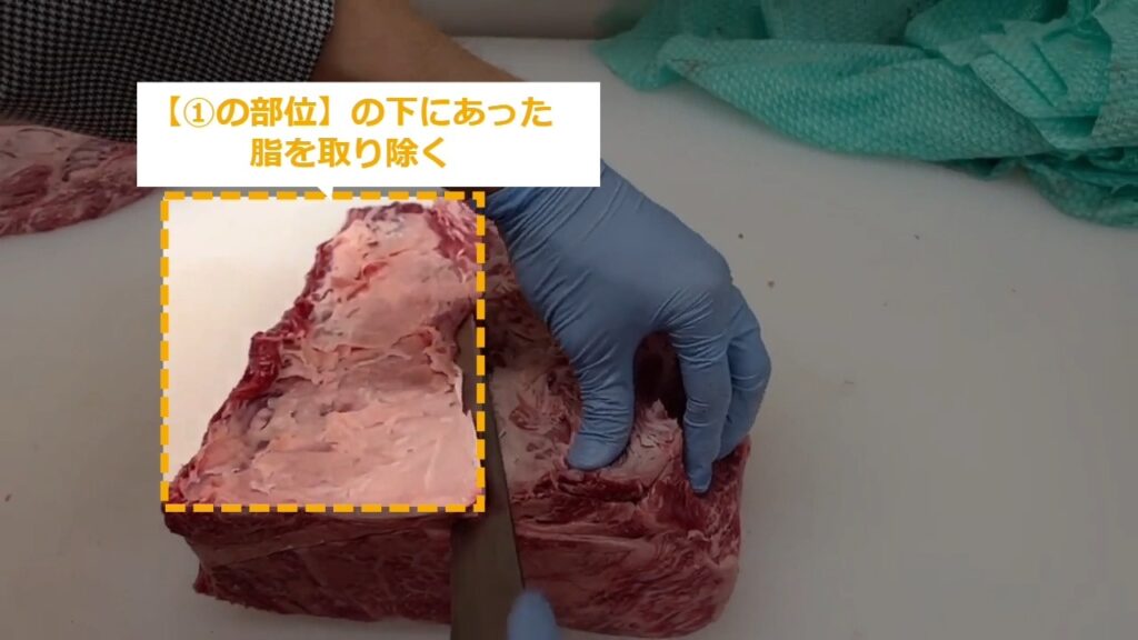 STEP15:肉を4つに切り分ける(3/9)[①の部位]の下にある脂を取り除く