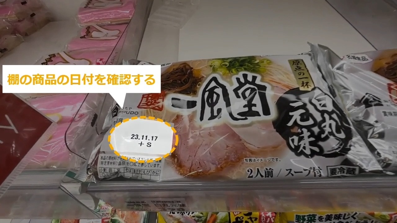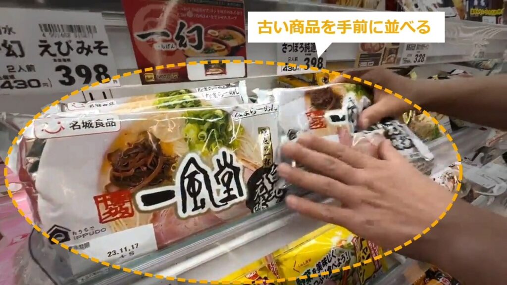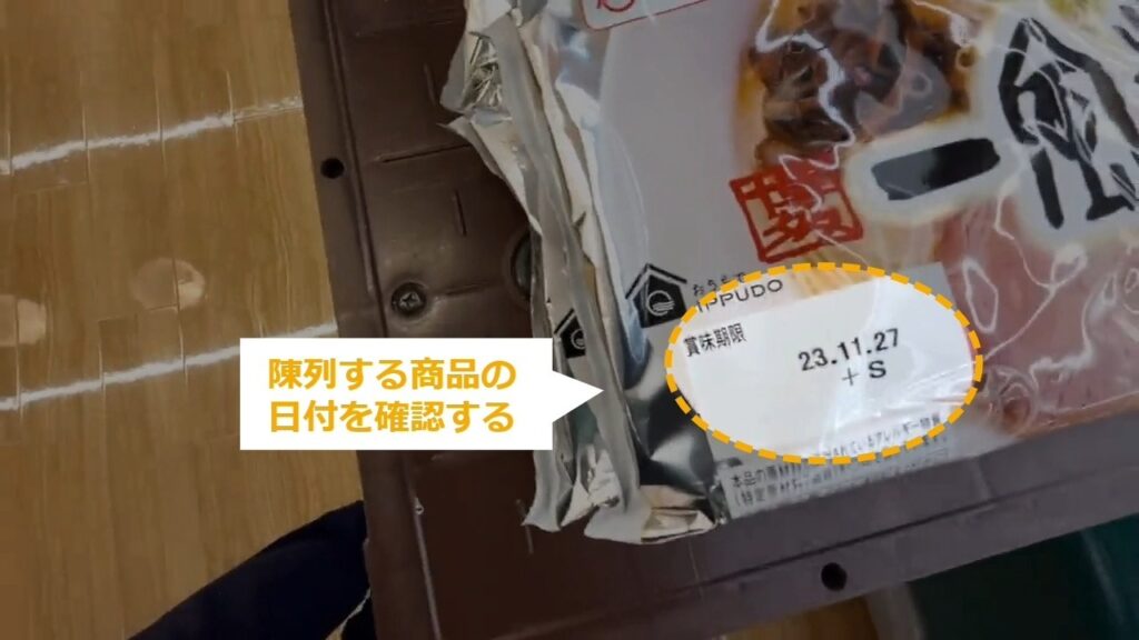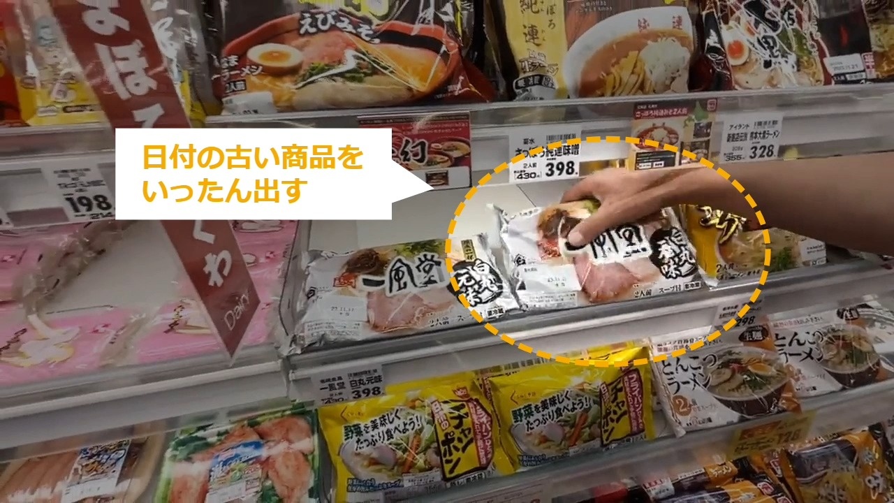 立体の商品の先入・先出 立体の什器に陳列するときに、先入・先出で並べる方法について説明します。 STEP1~:通し動画 STEP2~:手順の詳細 STEP1:【通し動画】立体の商品の先入・先出 ・商品の日付を確認する・古い商品をいったん出す ・新しい商品を奥に入れる ・古い商品を手前に並べる STEP2:棚の商品の日付を確認する STEP3:陳列する商品の日付を確認する STEP4:古い商品をいったん出す STEP5:新しい商品を奥に入れる STEP6:古い商品を手前に並べる