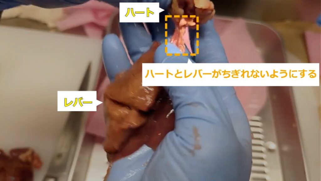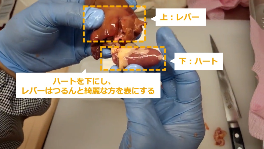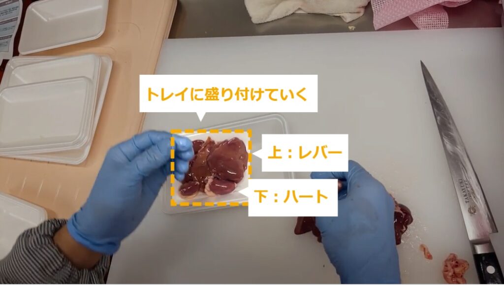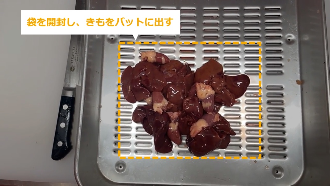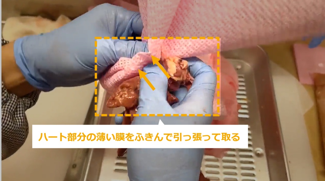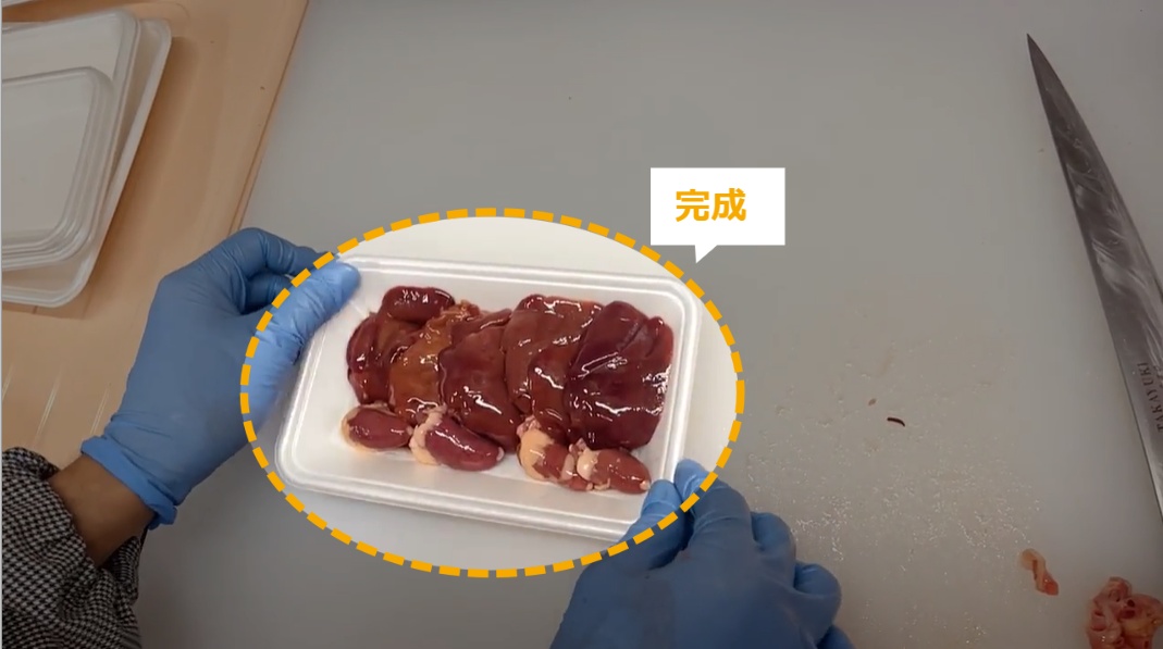若鶏きも ・若鶏きもの商品化について説明します。 STEP1~11:若鶏きもの商品化 STEP12:4個入りの完成図(画像) STEP1:通し動画 STEP2:袋を開封し、きもをバットに出す STEP3:肉から出るドリップを取る STEP4:薄い膜 STEP5:ハートの部分の薄い膜をふきんで引っ張って取る STEP6:ハートとレバーがちぎれないようにする STEP7:出ている管の部分を切り落とす STEP8:ドリップシートをトレイの上に置く STEP9:ハートを下にし、レバーはつるんと綺麗な方を表にする STEP10:トレイに盛り付けていく STEP11:完成 STEP12:4個入り