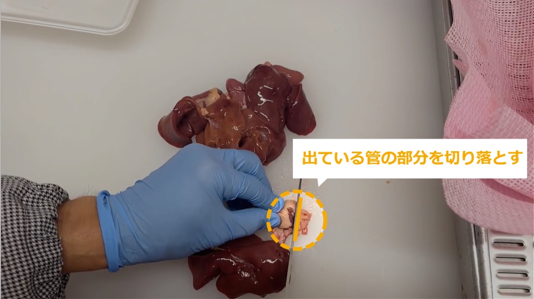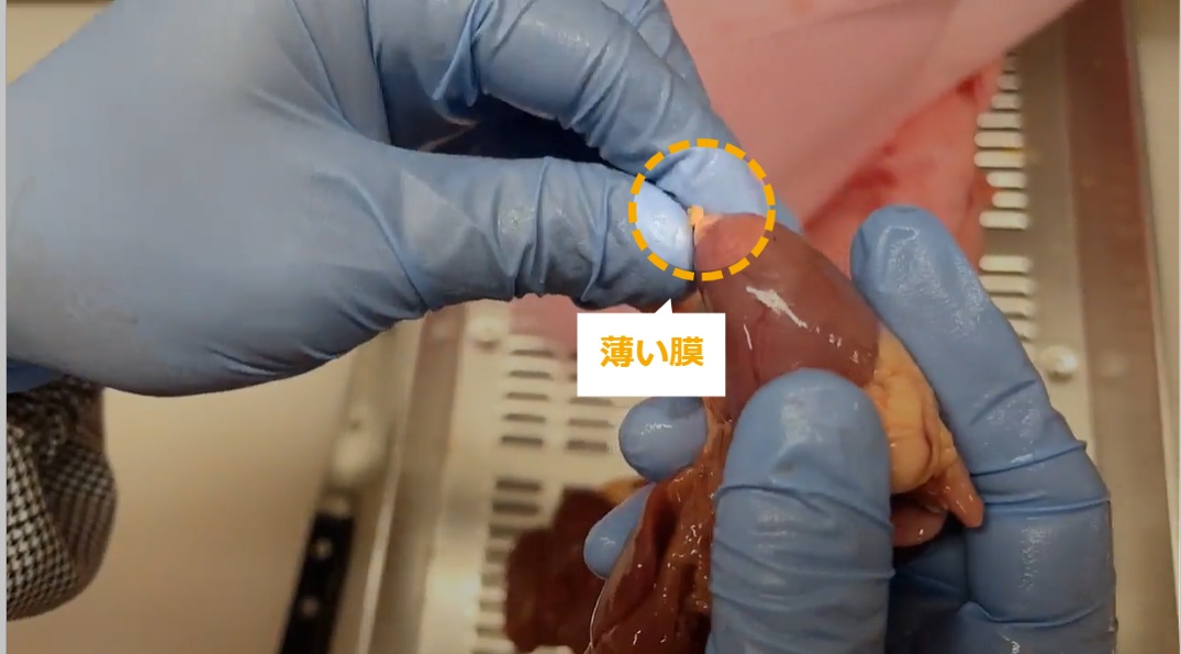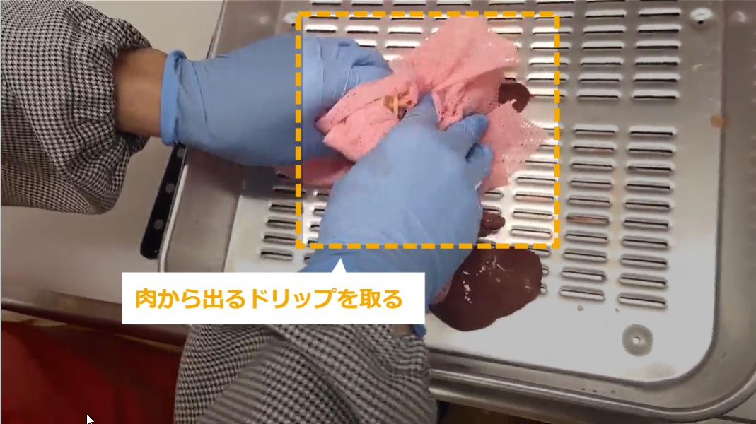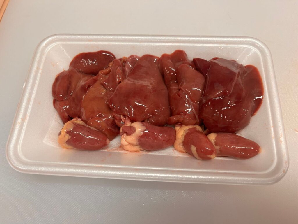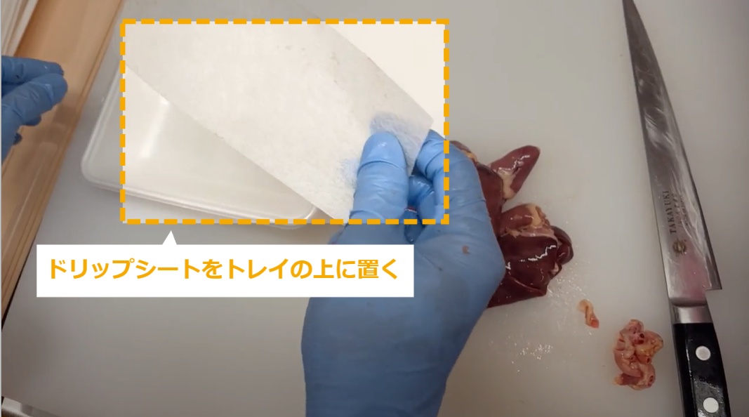 若鶏きも ・若鶏きもの商品化について説明します。 STEP1~11:若鶏きもの商品化 STEP12:4個入りの完成図(画像) STEP1:通し動画 STEP2:袋を開封し、きもをバットに出す STEP3:肉から出るドリップを取る STEP4:薄い膜 STEP5:ハートの部分の薄い膜をふきんで引っ張って取る STEP6:ハートとレバーがちぎれないようにする STEP7:出ている管の部分を切り落とす STEP8:ドリップシートをトレイの上に置く STEP9:ハートを下にし、レバーはつるんと綺麗な方を表にする STEP10:トレイに盛り付けていく STEP11:完成 STEP12:4個入り