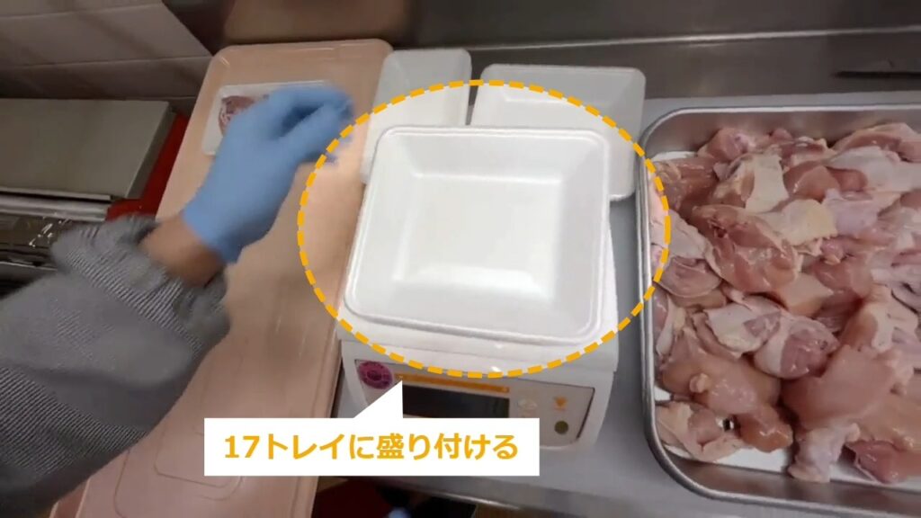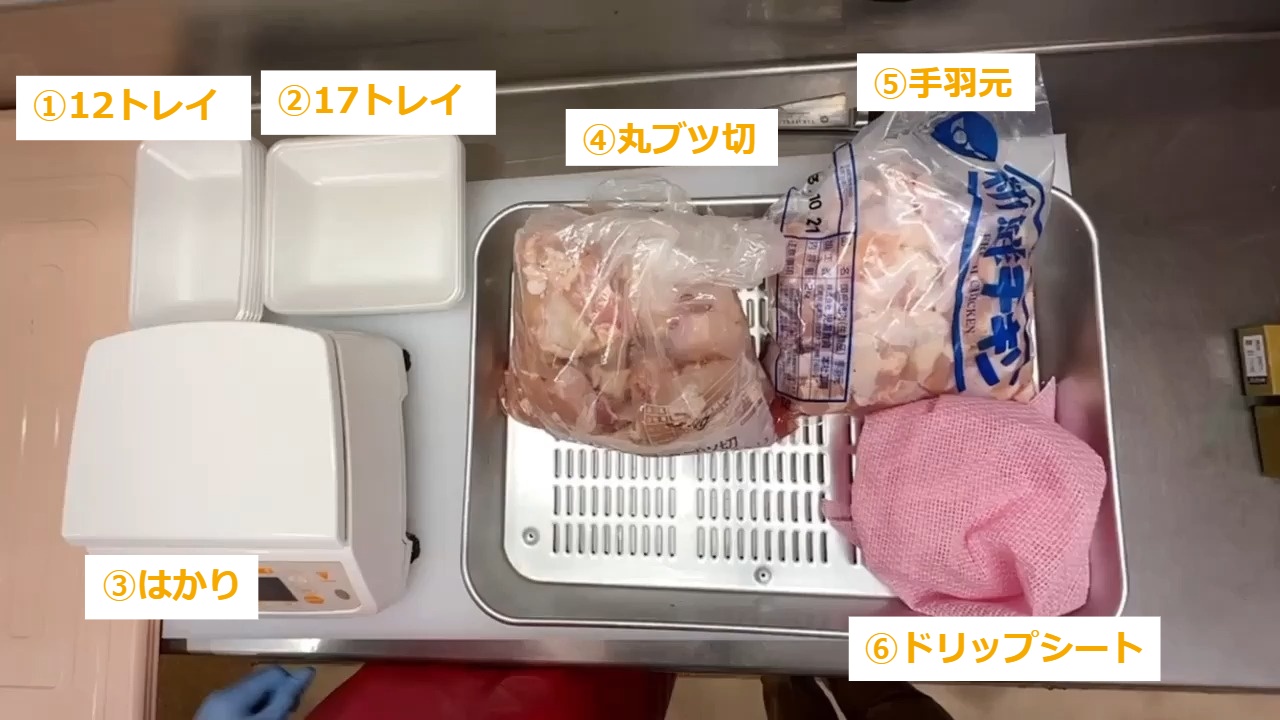 ①12トレイ ②17トレイ ③はかり ④丸ブツ切(モモ、ムネ) ⑤手羽元 ⑥ドリップシート