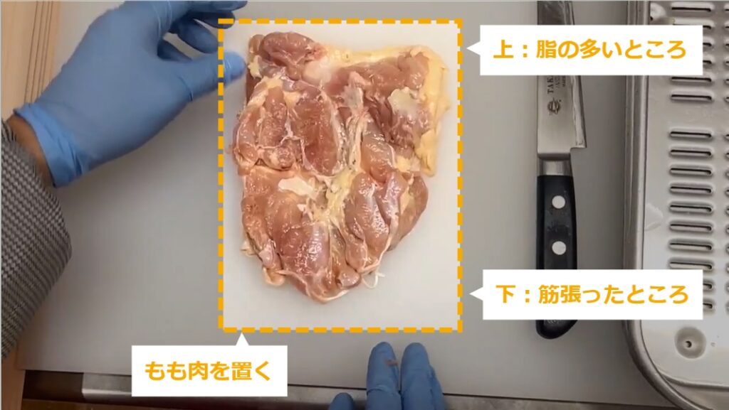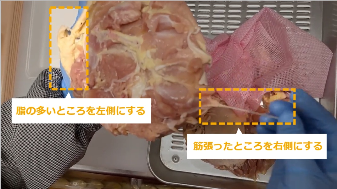 STEP9:もも肉の脂の多いところを上に、筋張ったところを下に置く