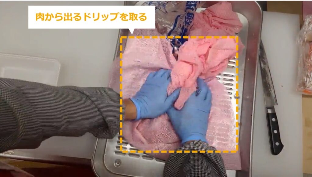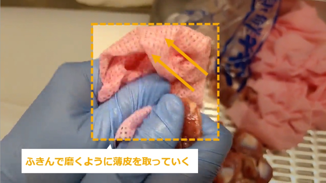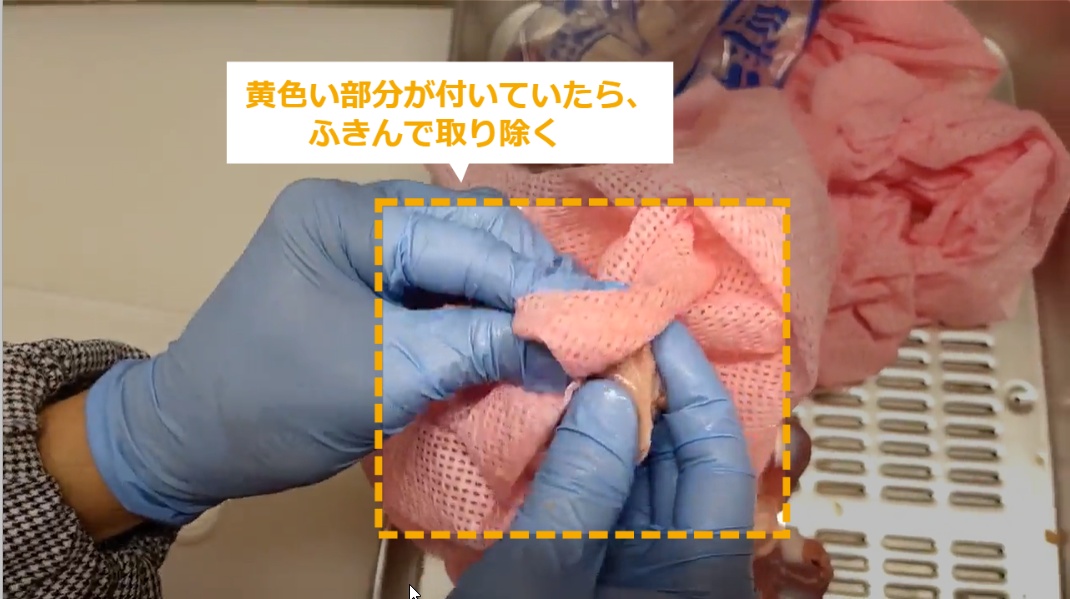 STEP5:黄色い部分が付いていたら、ふきんで取り除く