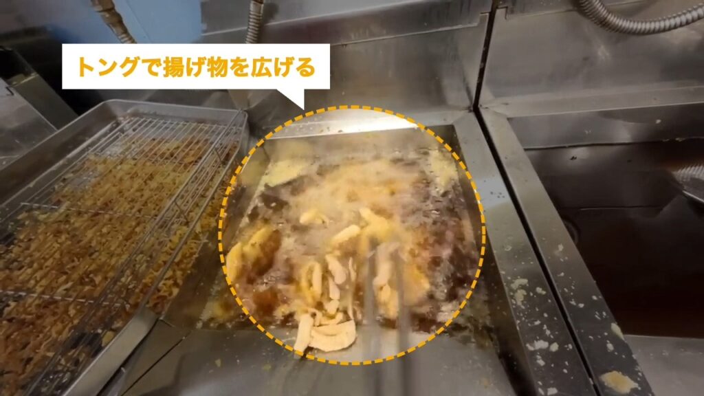 唐揚げに火が通るようにトングを使って広げます。