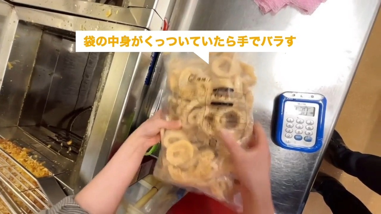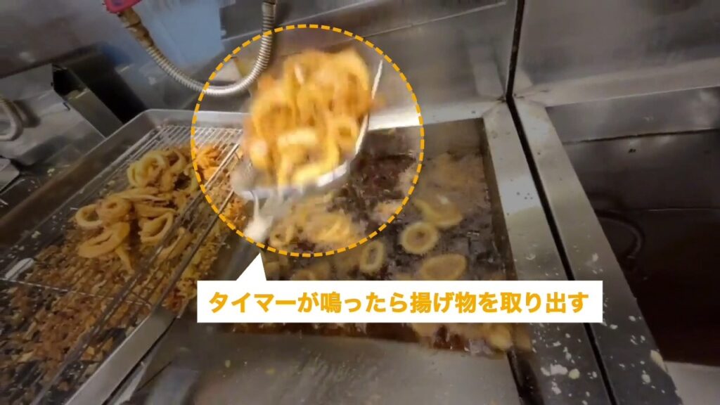 タイマーが鳴ったら揚げ物を油の中から取り出します。