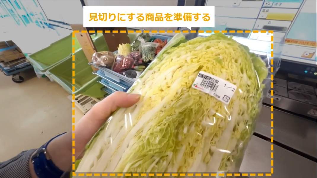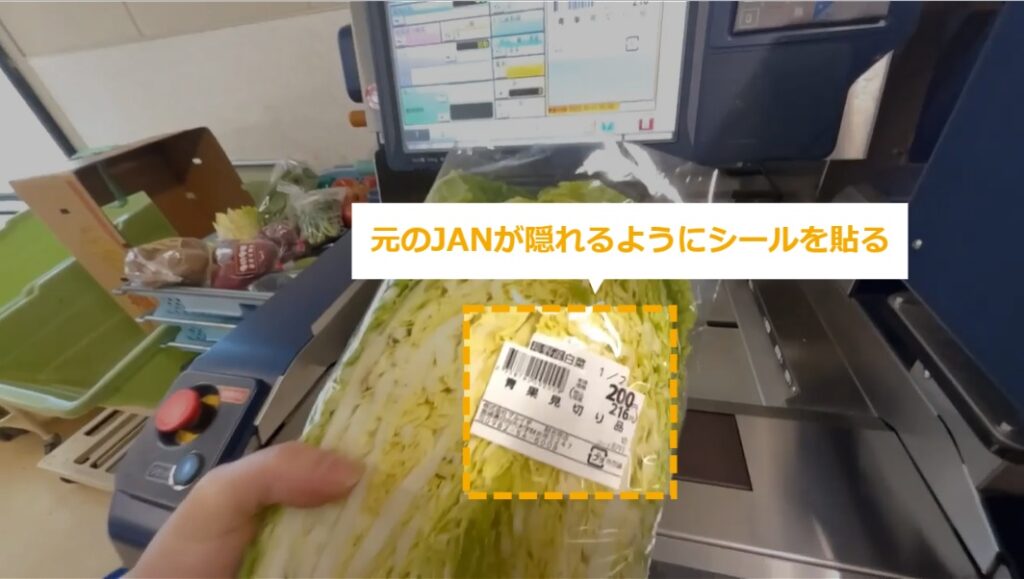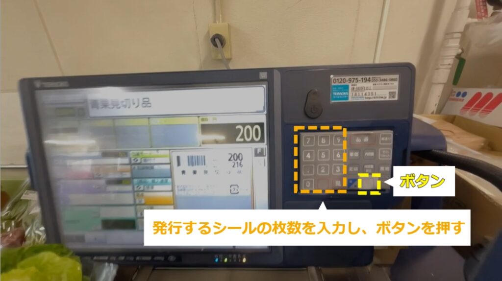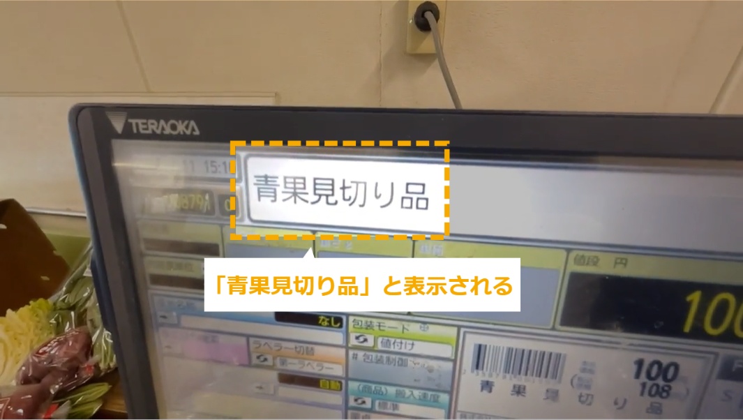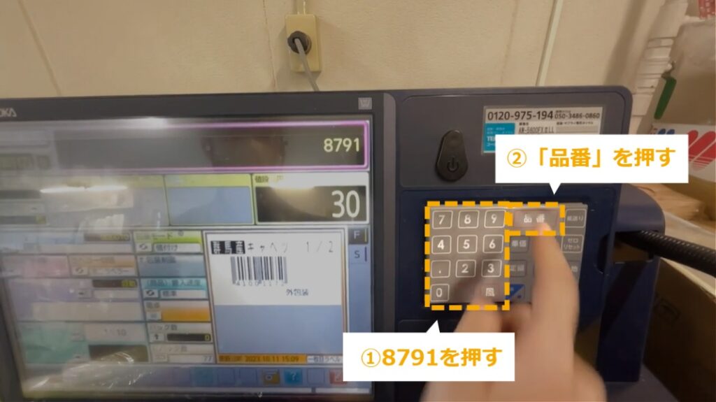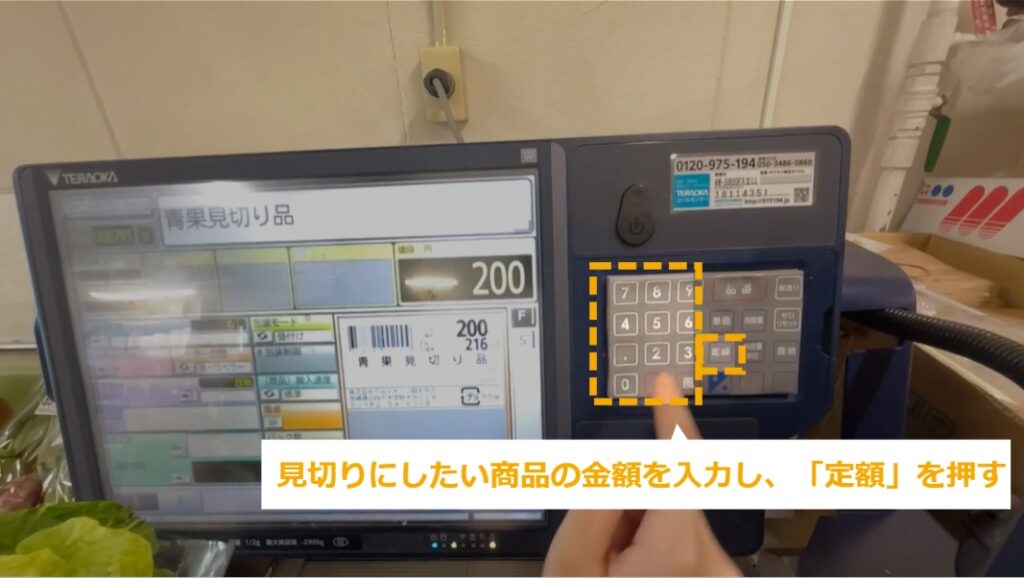 見切り商品の作り方 ・見切り商品のシールの作り方を説明します。 STEP1~7:見切り商品の作り方 STEP1:【動画】見切り商品の作り方 STEP2:見切りにする商品を準備する STEP3:8791を押し、「品番」を押す STEP4:「青果見切り品」と表示される STEP5:見切りにしたい商品の金額を入力し、「定額」を押す STEP6:発行するシールの枚数を入力し、ボタンを押す STEP7:元のJANが隠れるようにシールを貼る