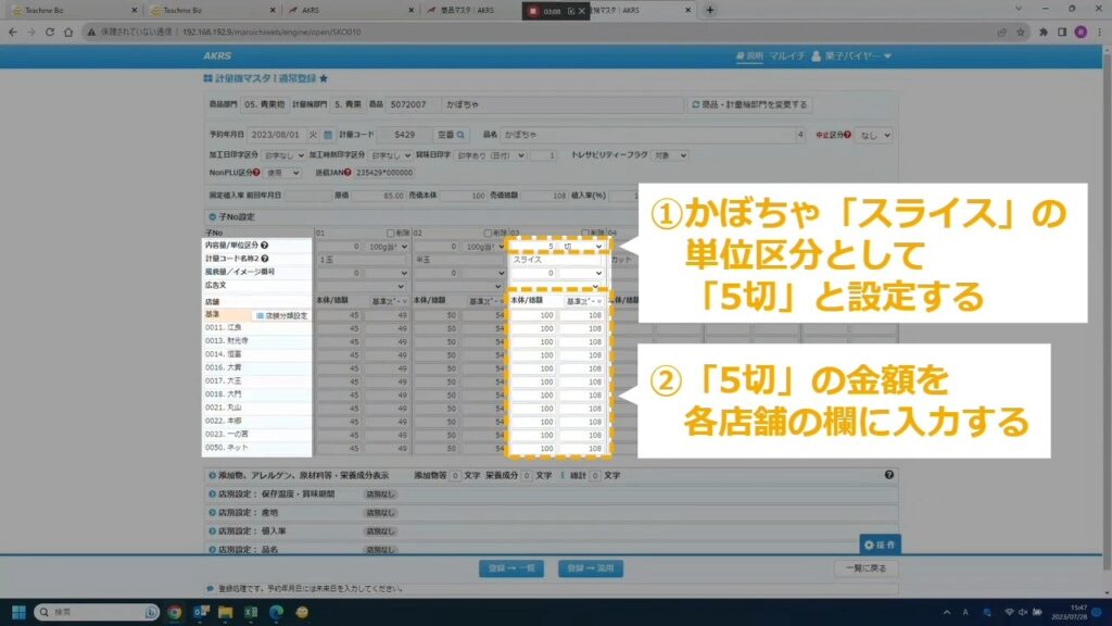 単位区分を「100g当り」以外に設定した場合、定額値付モードになります。 画像の例では1P 5切で100円という設定に。