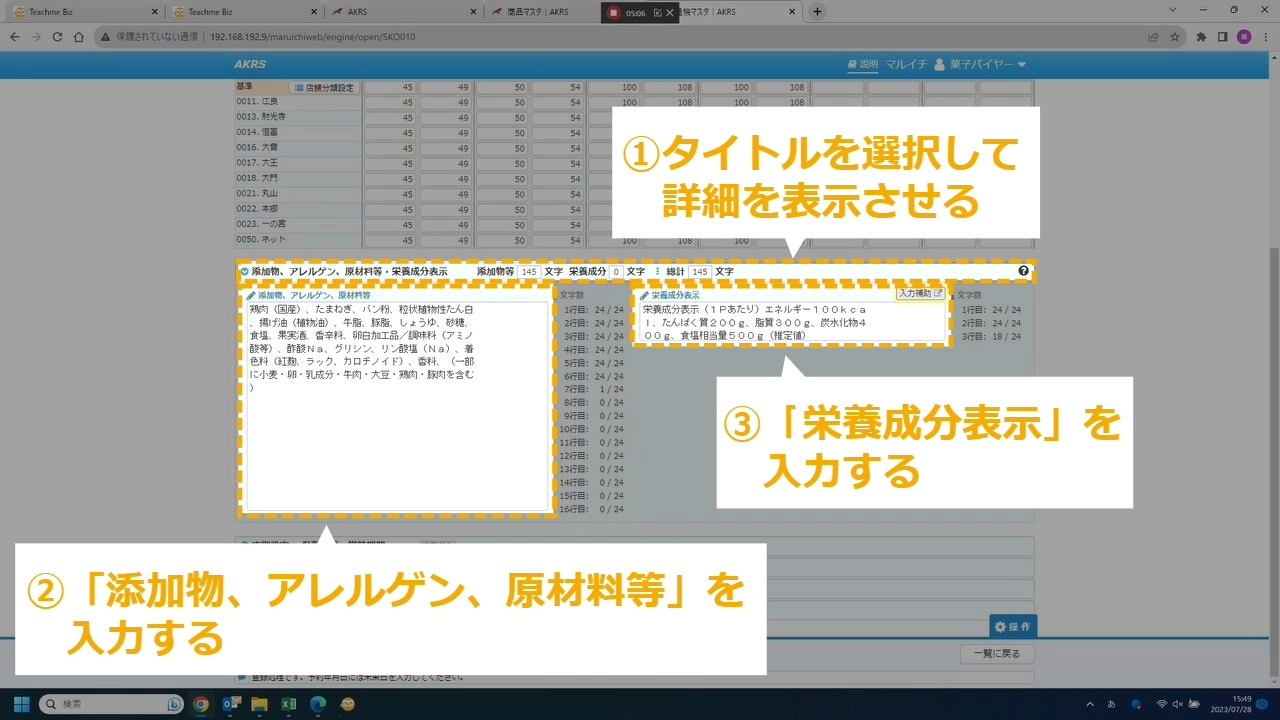 STEP26:添加物、アレルゲン、原材料等、栄養成分表示を入力する