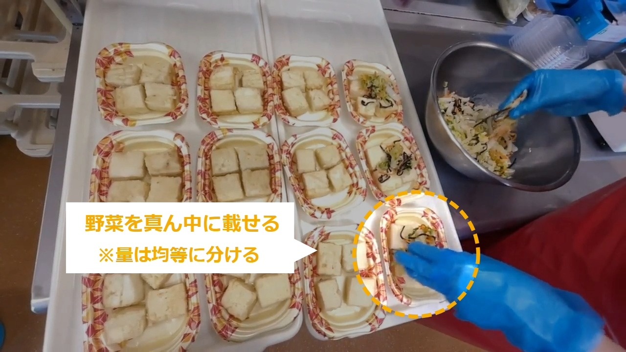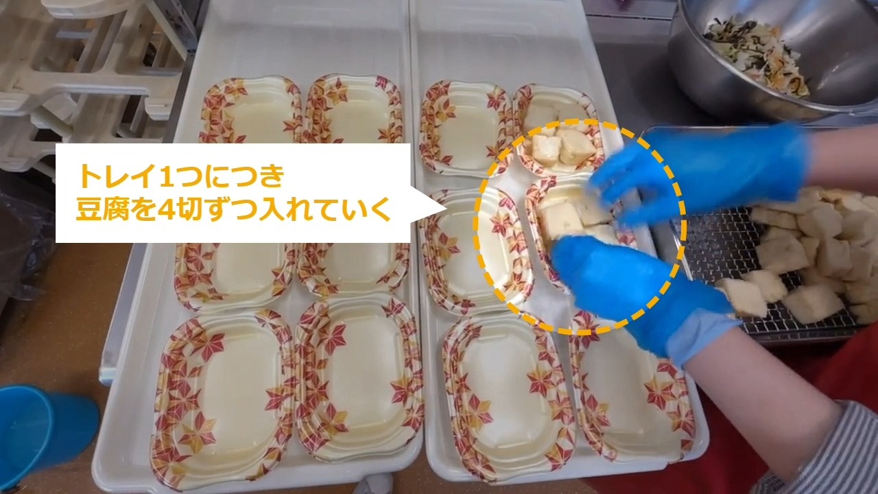STEP24:盛り付け(1/3):豆腐を4切ずつ入れる