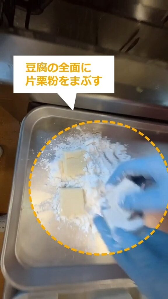 STEP13:豆腐を揚げる(1/5):豆腐に片栗粉をまぶす
