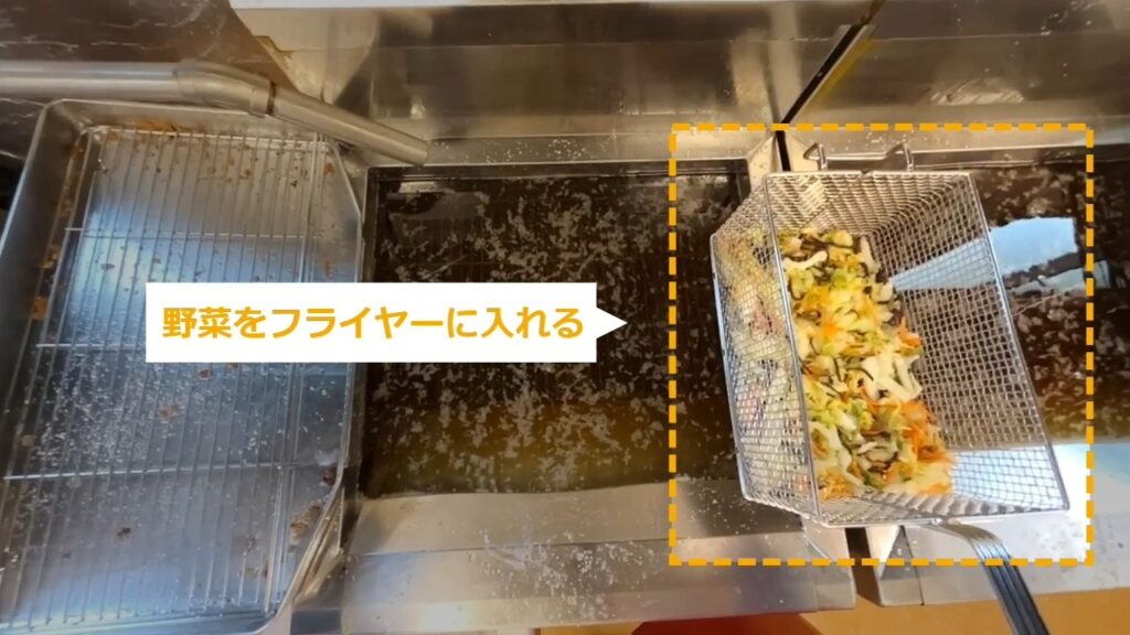 STEP18:野菜を油に通す(1/2):野菜をフライヤーに入れる