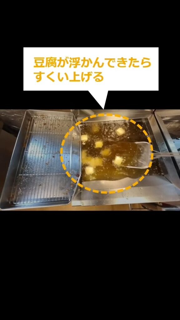 STEP16:豆腐を揚げる(4/5):豆腐が浮かんできたらすくい上げる