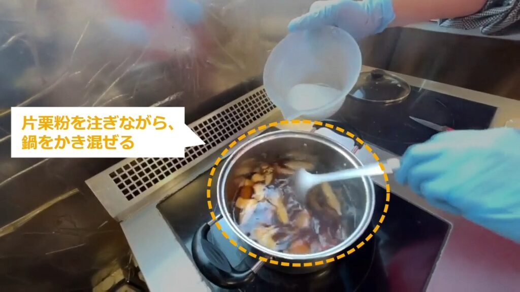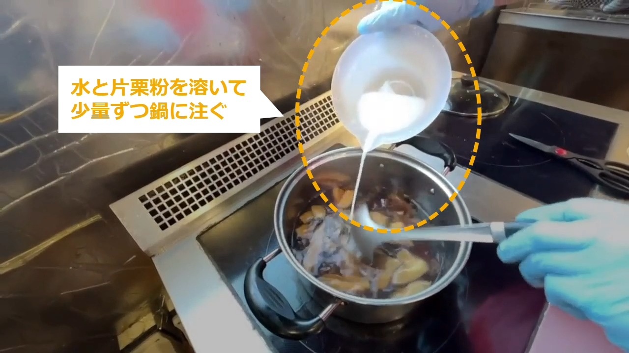 STEP22:あんかけ出汁を作る(3/4):片栗粉を注ぎながら、鍋をかき混ぜる