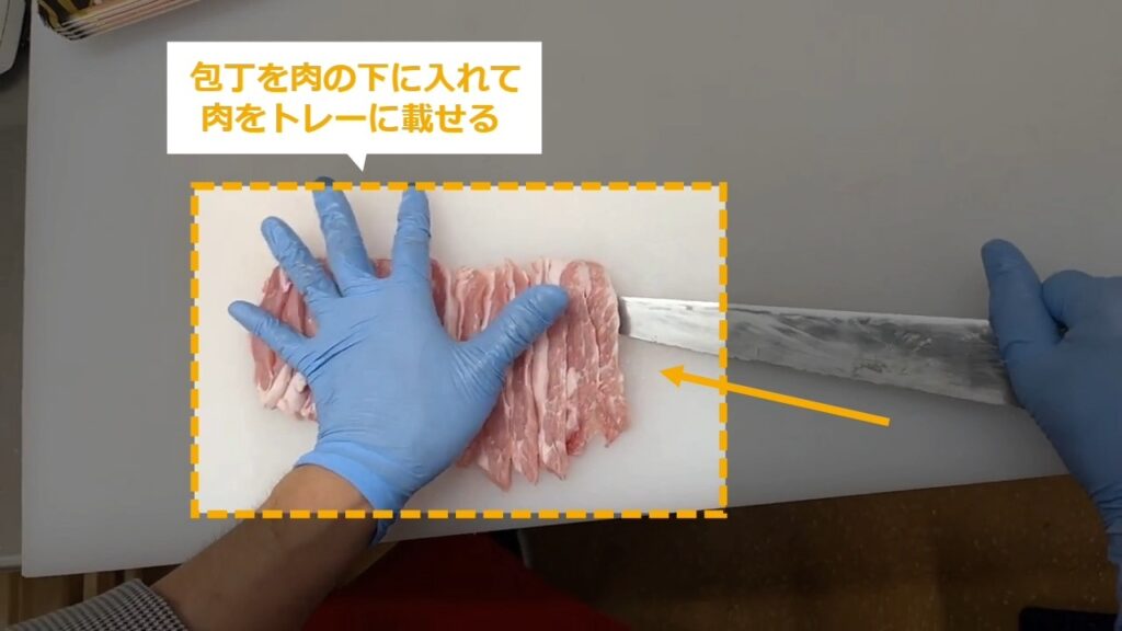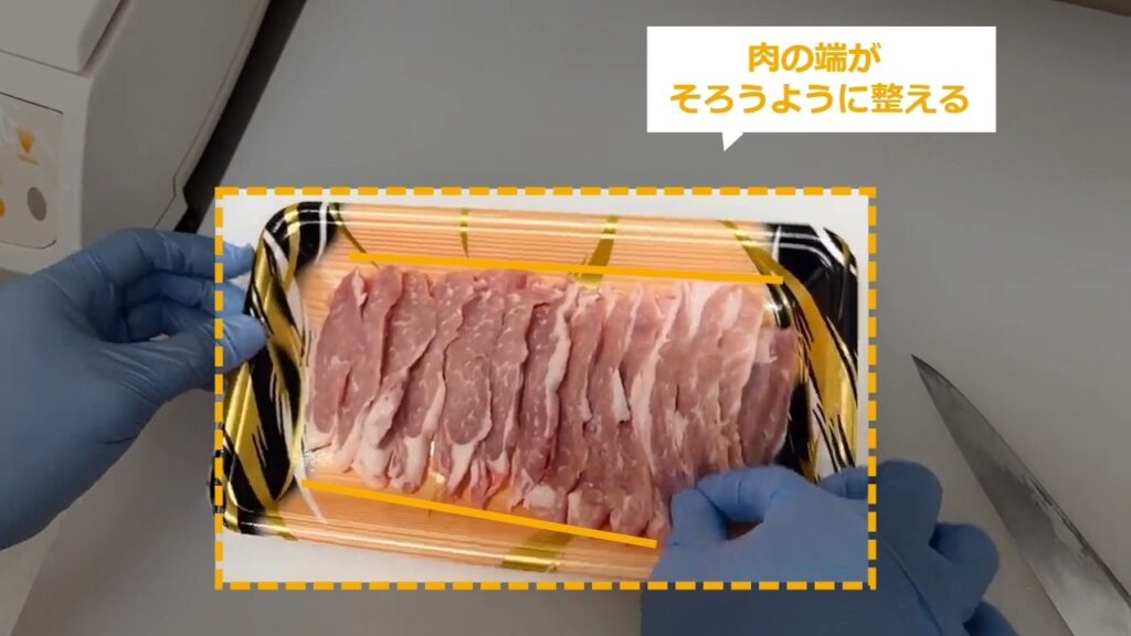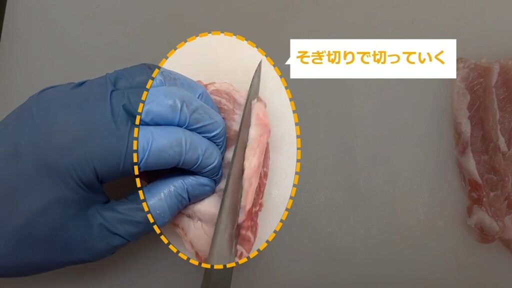豚トロの焼肉 ・「豚トロの焼肉」の商品化について説明します。 STEP2~4:商品化 STEP1:【動画】商品化 STEP2:そぎ切りで切っていく STEP3:肉をトレーに載せる STEP4:肉の端がそろうように整える