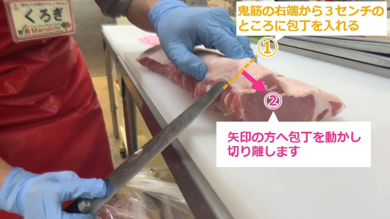 ・(写真の①)鬼筋の右端から3センチのところに包丁を入れます。