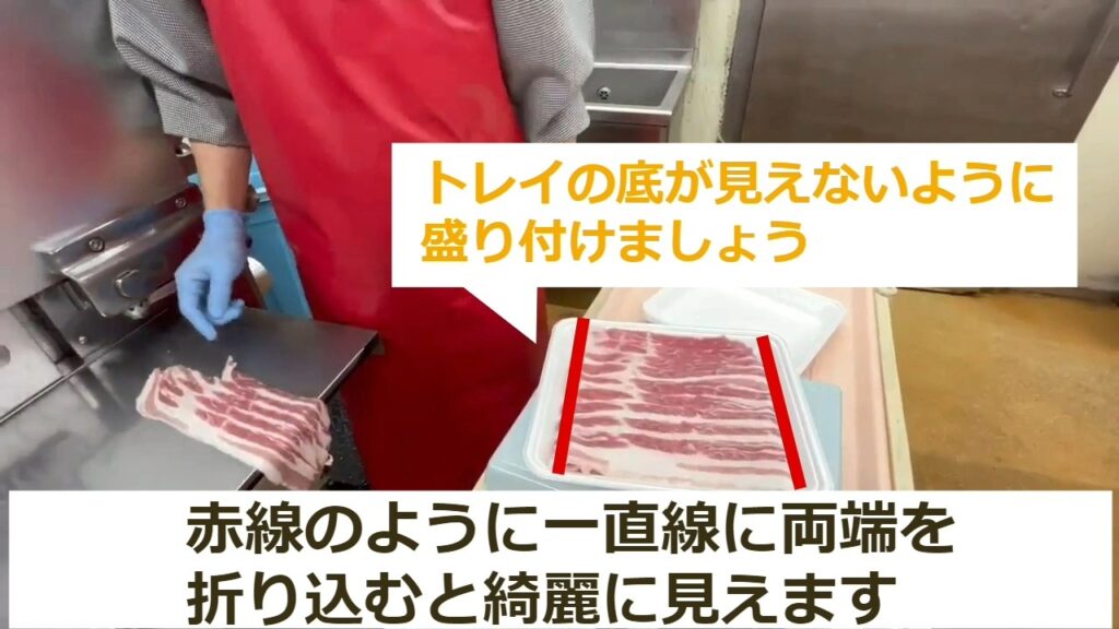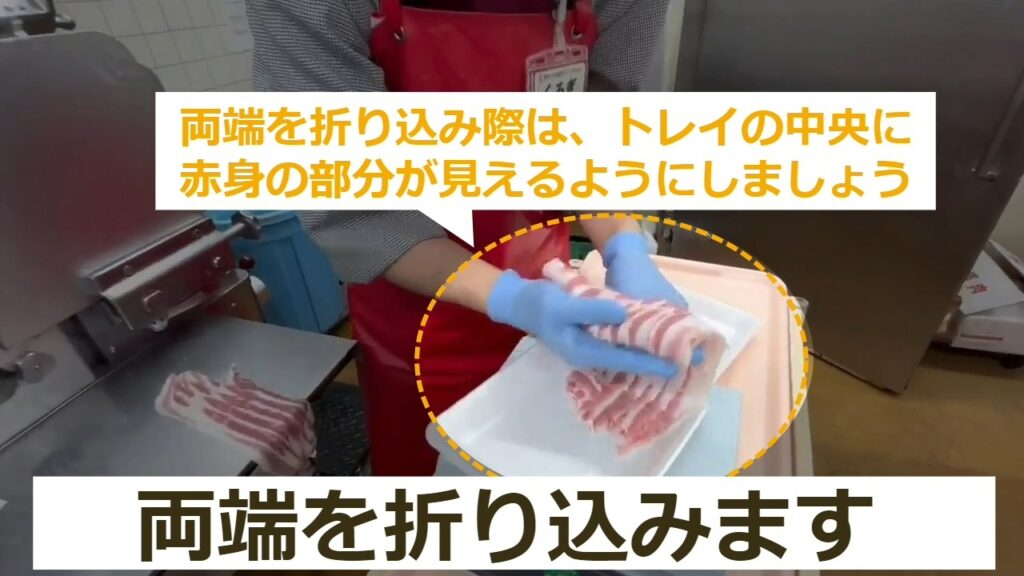 ・両端を折り込み際は、トレイの中央に赤身の部分が見えるようにしましょう。