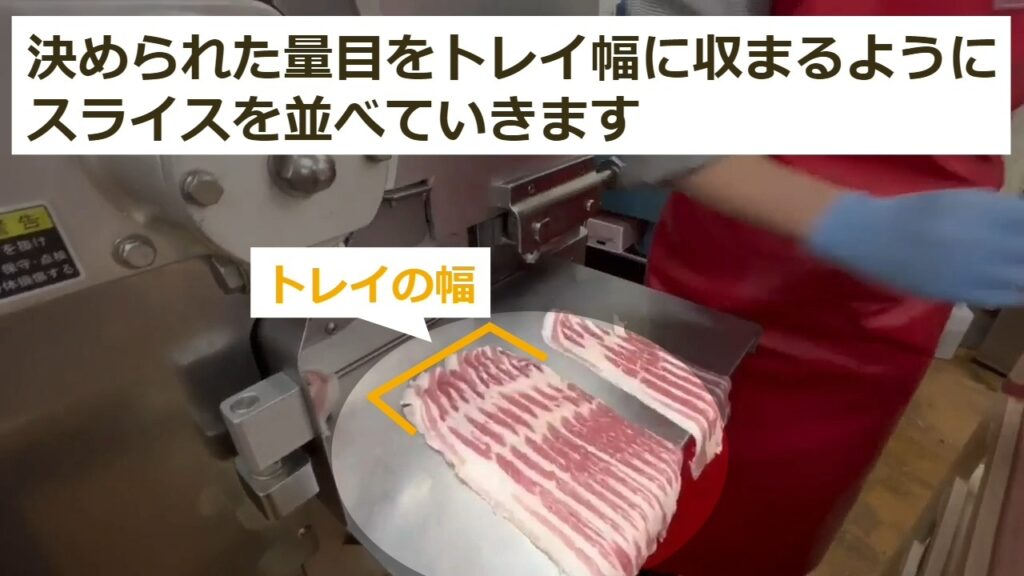 STEP4:決められた量目をトレイ幅に収まるようにスライスを並べていきます
