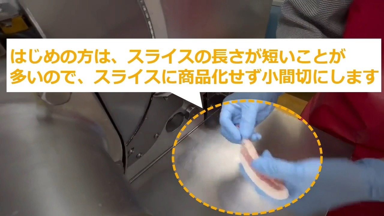 STEP3:はじめの方は、スライスの長さが短いことが多いので、スライスに商品化せず、小間切にします。