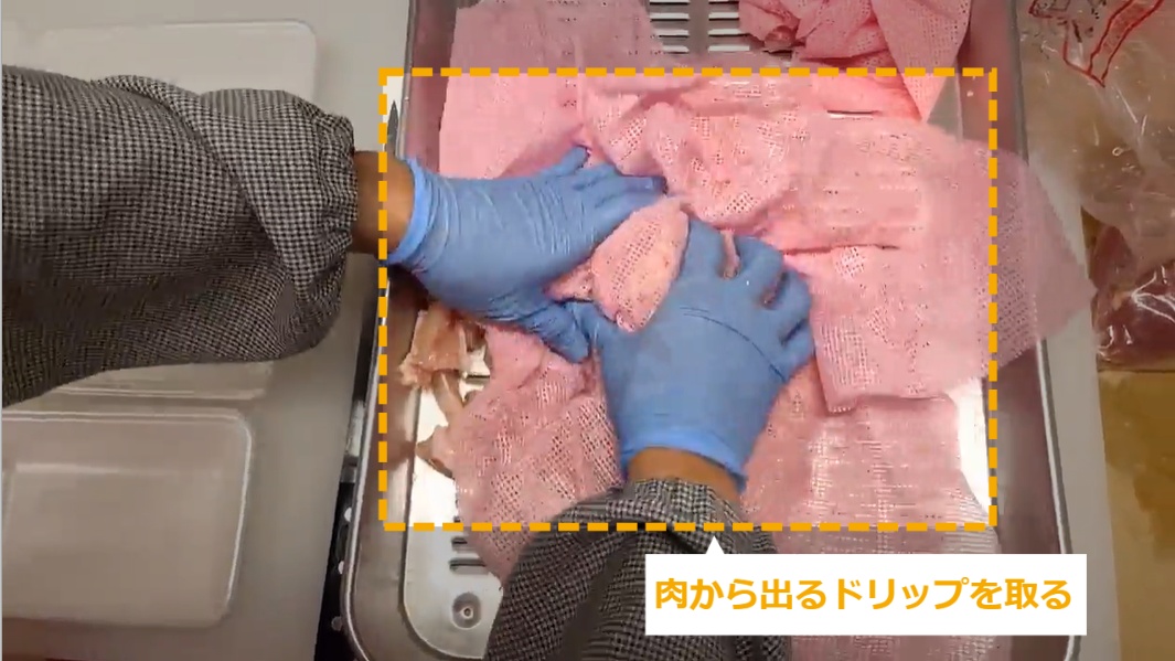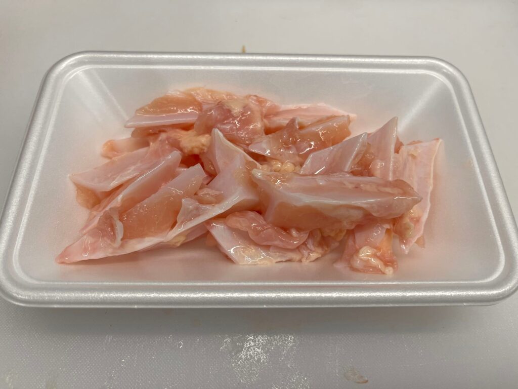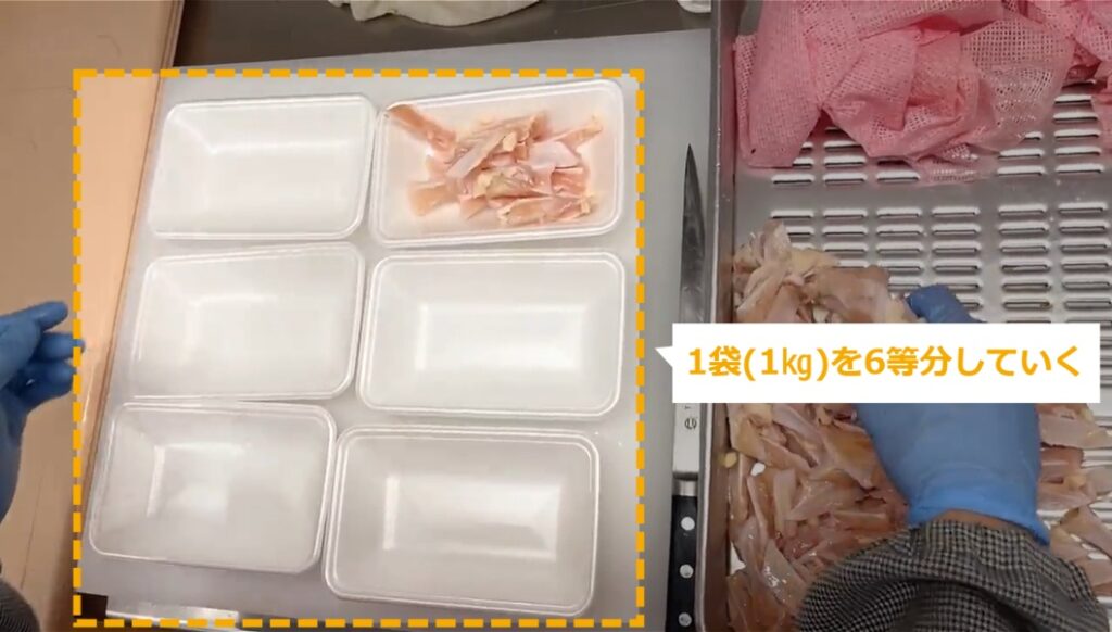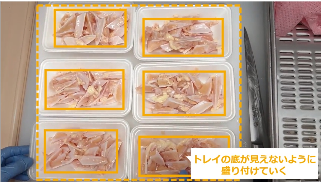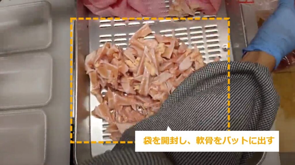 軟骨 ・軟骨の商品化について説明します。 STEP1~5:軟骨の商品化 STEP6:完成図(画像) STEP1:【動画】軟骨の商品化 STEP2:袋を開封し、軟骨をバットに出す STEP3:肉から出るドリップを取る STEP4:1袋(1㎏)を6等分していく STEP5:トレイの底が見えないように盛り付けていく STEP6:完成図