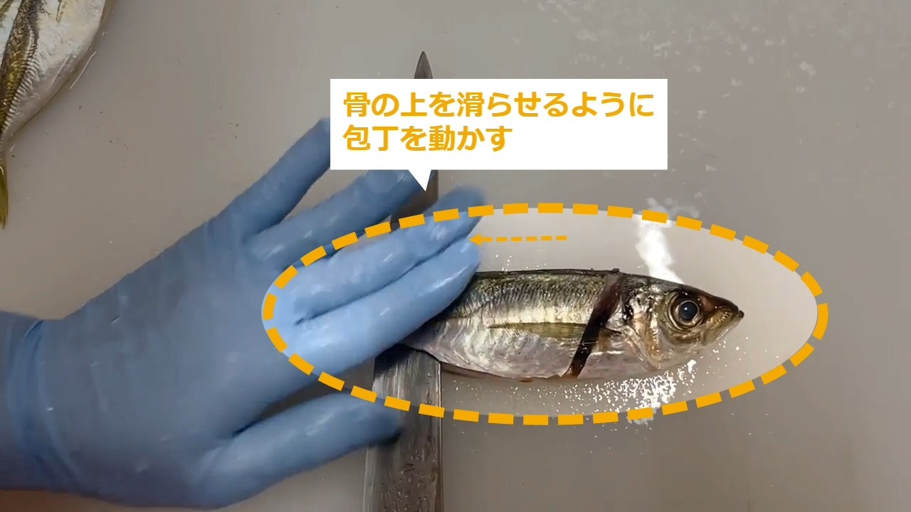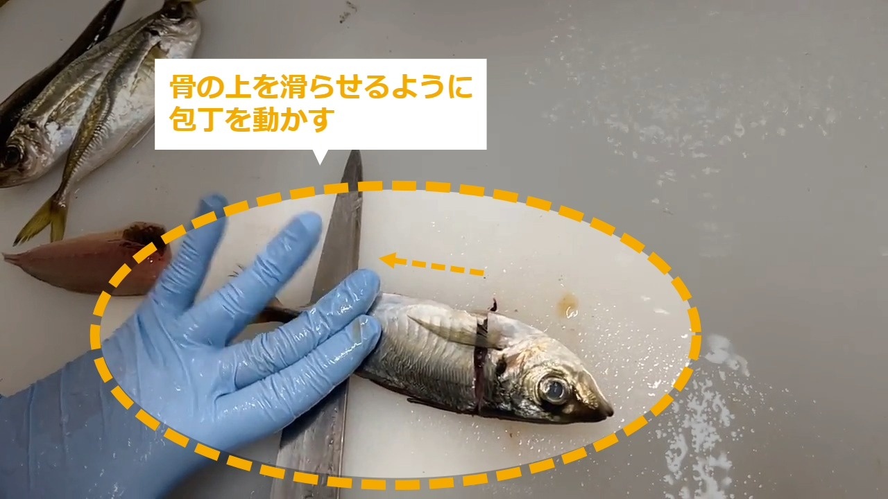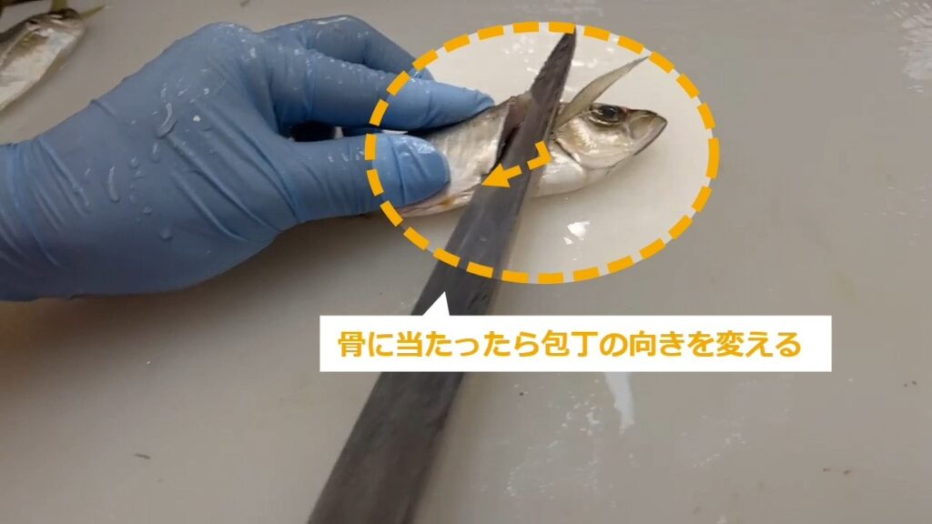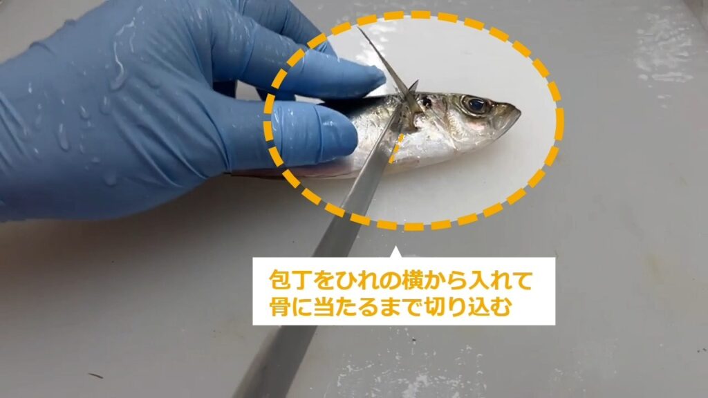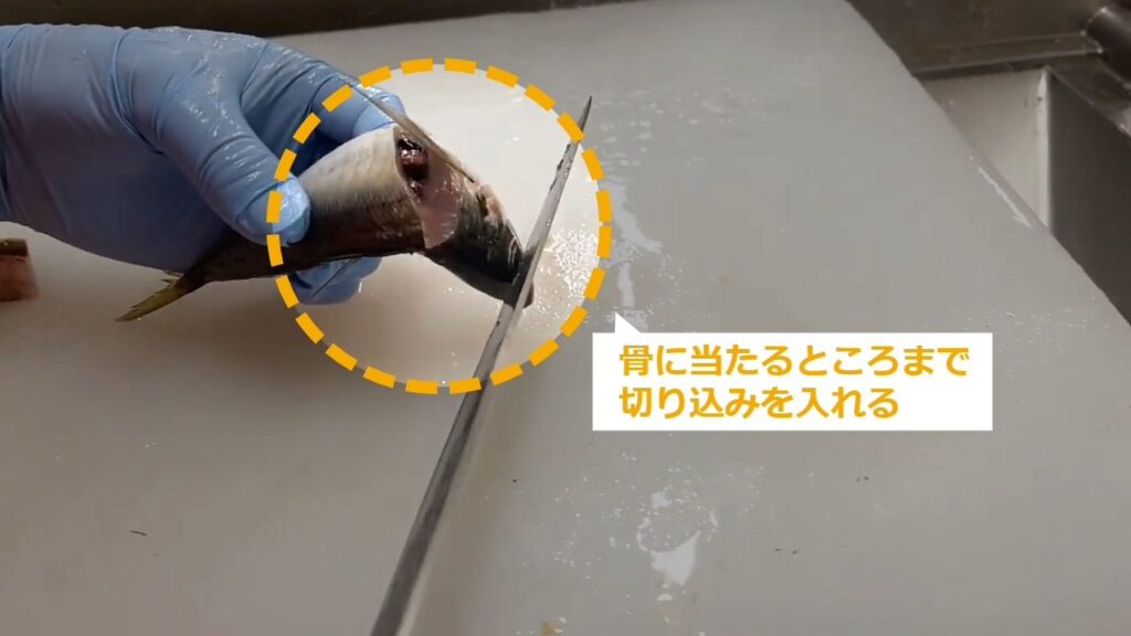 STEP4:包丁をヒレの横から入れて骨に当たるまで切り込む