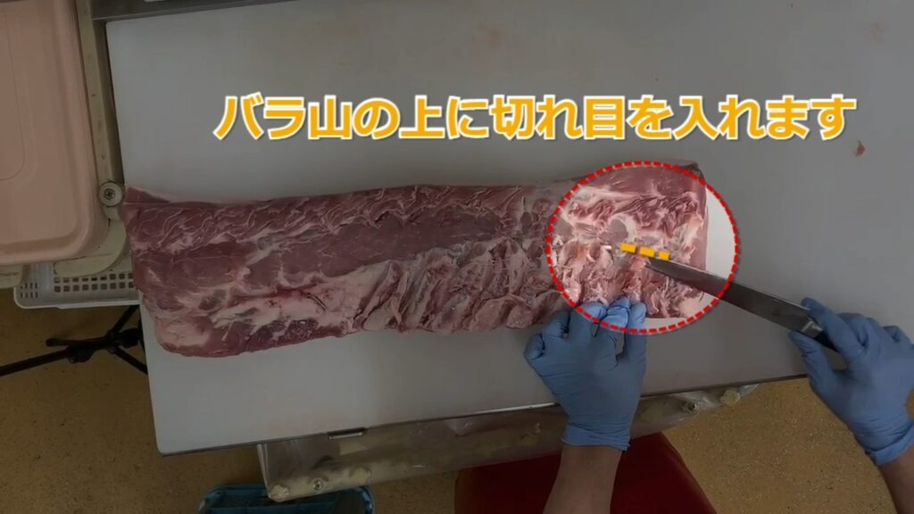 STEP15:表面の厚い脂を薄く除去します。脂身は8ミリ~1センチ残すようにトリミングしていきましょう